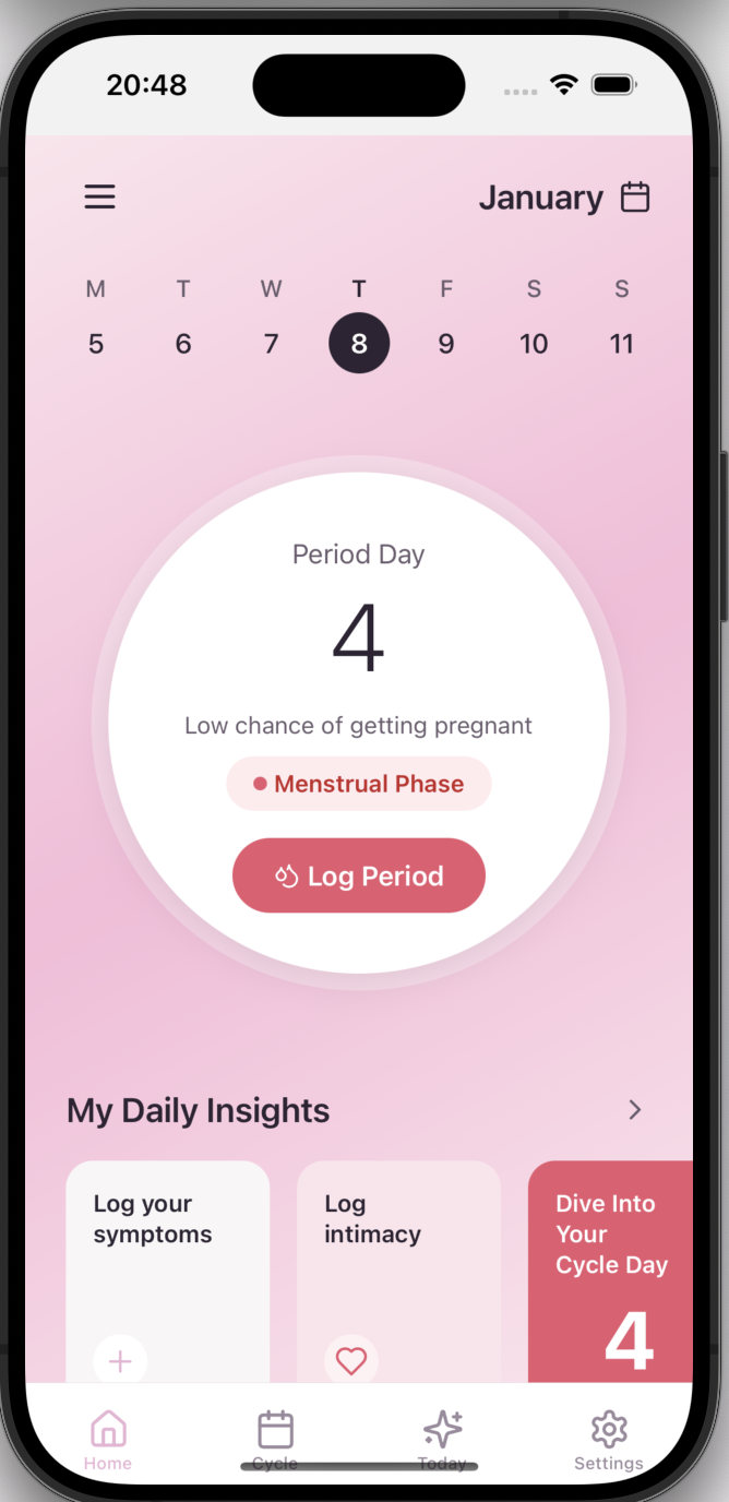 Log your period in seconds. Track symptoms effortlessly. Your data stays private and fully yours.